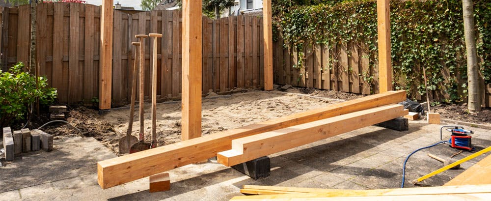 Nu we weten wat we allemaal nodig hebben voor een Douglas overkapping, is het tijd om over de bouw van de overkapping te praten. De bouw van een Douglas overkapping is simpeler dan je misschien wel denkt en is op te delen in een meerdere stappen. De stappen voor het maken van een Douglas hout overkapping zijn als volgt: plaatsen betonpoeren → palen op de betonpoeren bevestigen → ringbalken en schorren plaatsen → dakliggers monteren → dakbedekking plaatsen → mastiekschroten en boeidelen plaatsen → waterafvoer plaatsen → dakleer aanbrengen → wanden maken → inrichten → genieten.