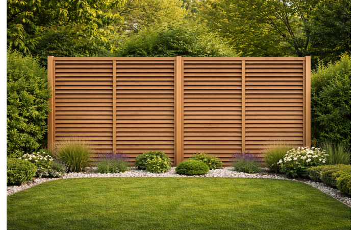 - Louvre lamellen: Schuin geplaatste planken zorgen voor privacy en ventilatie.
