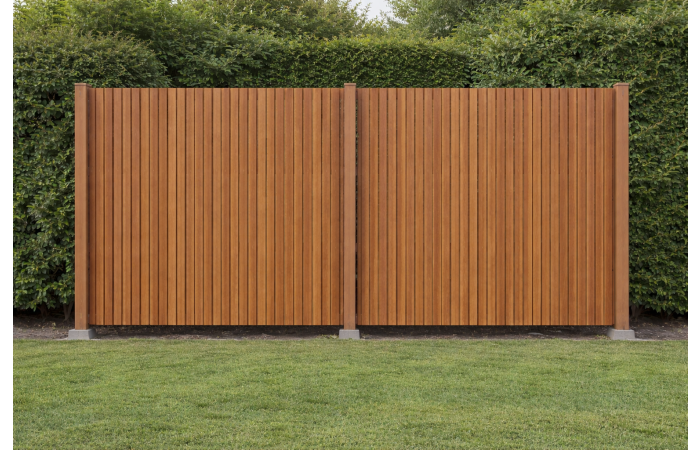 De schermen zijn opgebouwd uit fijn gelamelleerde Keruing latten in verticale uitvoering en zijn dubbelzijdig afgewerkt voor een luxe uitstraling aan beide kanten. Hierdoor ontstaat niet alleen in je eigen tuin een fraaie schutting, maar ook aan de zijde van de buren – ideaal als nette en gelijkwaardige erfafscheiding. In combinatie met stevige hardhouten palen vormt dit een robuuste schutting met een lange levensduur.