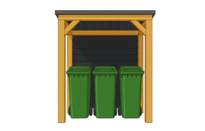 De HBM Container Overkapping is de ideale oplossing om afvalcontainers netjes, droog en uit het zicht op te bergen. Gemaakt van duurzaam Lariks/Douglas met een stevig zwart golfplaten dak. Dankzij de open voorzijde en goede ventilatie blijven de containers fris en droog. Eenvoudig te monteren en optioneel uit te breiden met een achterwand (blank of zwart).