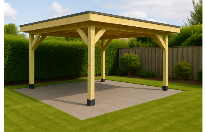 Onze HBM Douglas Overkapping bouwpakketten bestaan niet alleen uit een Douglas houtskelet, maar bestel je eventueel inclusief fundering en dakbedekking naar keuze.