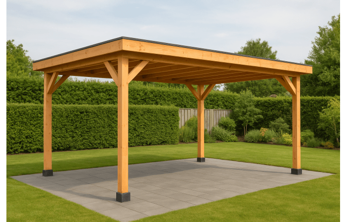 Standaard wordt de overkapping geleverd met open wanden. Wil je meer privacy of beschutting? Bestel dan extra Douglas/Lariks planken mee om de wanden eenvoudig dicht te maken.