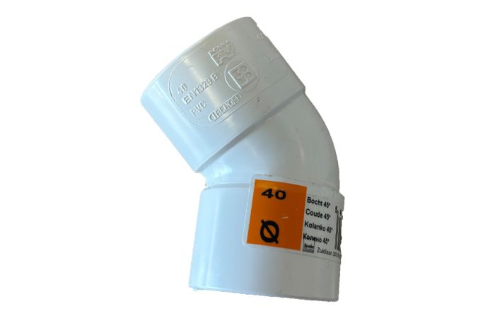 Deze PVC bocht met een diameter van 40 mm en een hoek van 45° is uitgevoerd in wit en voldoet aan de Europese norm EN1329-B. De bocht wordt gebruikt om een leiding in een vloeiende hoek af te laten buigen en is geschikt voor diverse binnenriolering- en waterafvoertoepassingen. Dankzij de mofverbindingen sluit dit onderdeel naadloos aan op standaard PVC-buizen en is montage eenvoudig met PVC-lijm.